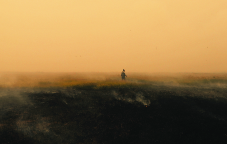 The villagers of Shologon lies in the taiga of Siberia, and also in the midst of a “control zone” imposed by Moscow that means the authorities are not required to combat the forest fires that often engulf large swathes of forest in the region. The villagers are left to fend for themselves, driving to the edge of the raging fires to tackle the flames as clouds of orange smoke envelop the forests.